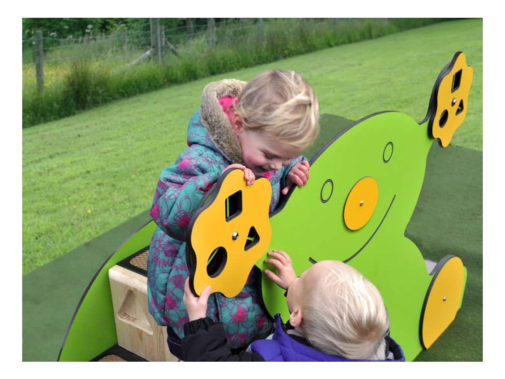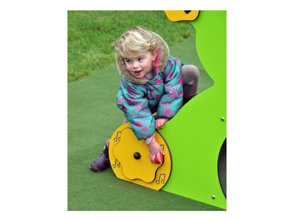 Skluzavka i tunel jsou z nerezové oceli. Čelní strana z 12 mm silného kompaktního laminátu ve tvaru medvídka, kdy na ouškách jsou otočná kolečka a děti se mohou učit tvary a barvy, v dolní části si děti mouhou zkoušet různé tóny, zvuky a šumy.