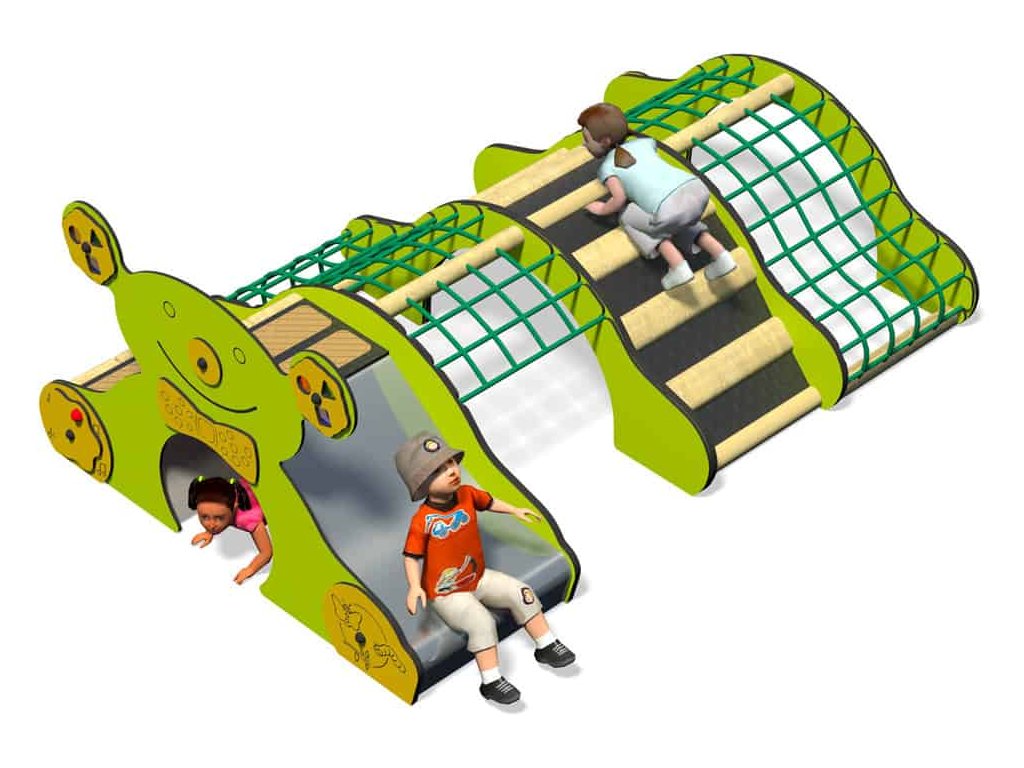 Jak děti zapojit do kolektivu a naučit je hrát si s ostatními dětmi? Firma Playdale připravila pro děti supr sestavu pro podporu pohybového vývoje a motoriky u dětí od devíti měsíců do 3 let. K tomu výborně poslouží kombinace skluzavky s tunelem. Na skluzavku se děti dostanou po dřevěných schůdcích.