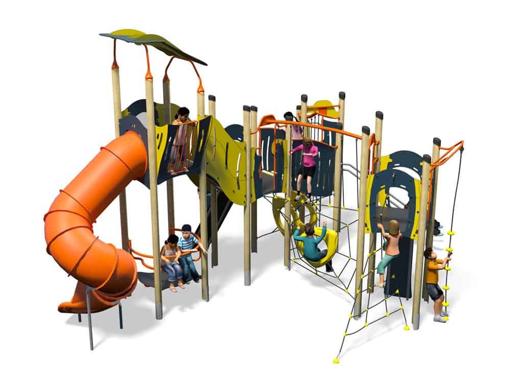 Na podestu věže 110 x 110 cm se dítě dostane po lezecké stěně nebo lanové rampě, dolů se sklouzne v tubusové laminátové nebo ocelové skluzavce dlouhé 280 cm. Hřiště obsahuje ještě další zajímavé prvky - zkroucenou lanovou síť, prstencový tunel, kruhové sedadlo, pavoučí síť, rozhlednu...