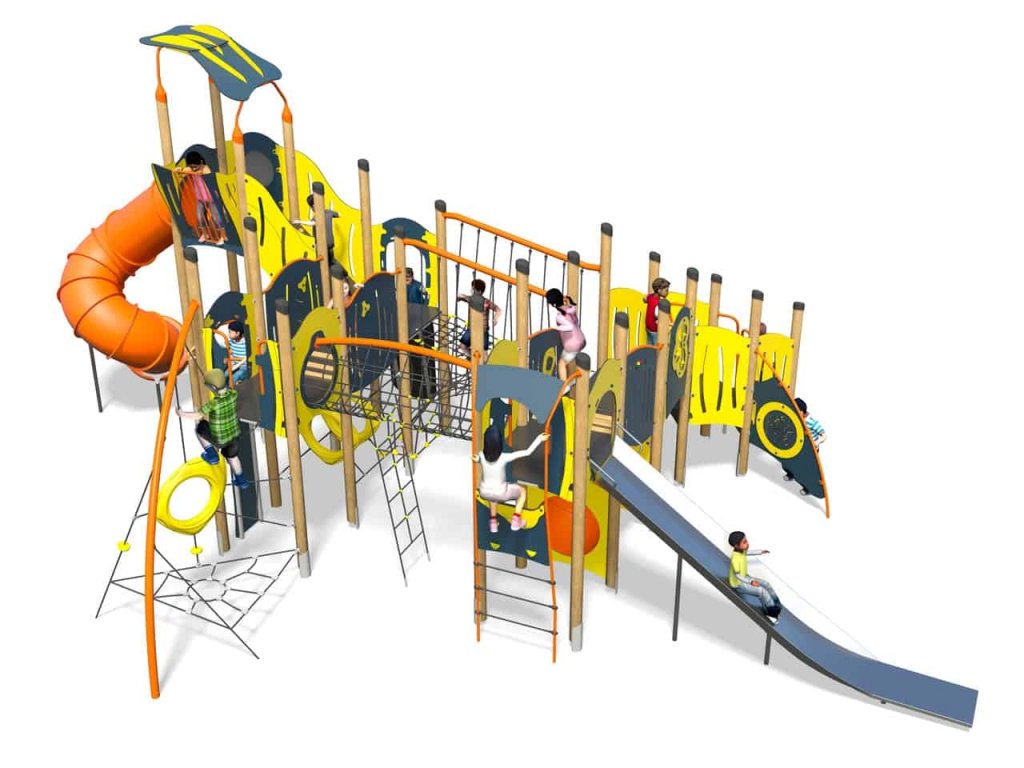 Na podestu věže 110 x 110 cm se dítě dostane po lezecké stěně, točitými schody nebo po lanové rampě, dolů se sklouzne v tubusové laminátové nebo ocelové skluzavce dlouhé 280 cm nebo po šikmé, otevřené, ocelové skluzavce. Hřiště obsahuje ještě další zajímavé prvky - lanový tunel, kruhové sedadlo, provazník, rozhlednu, šikmou lanovou jámu, prstencový tunel, točité schodiště...