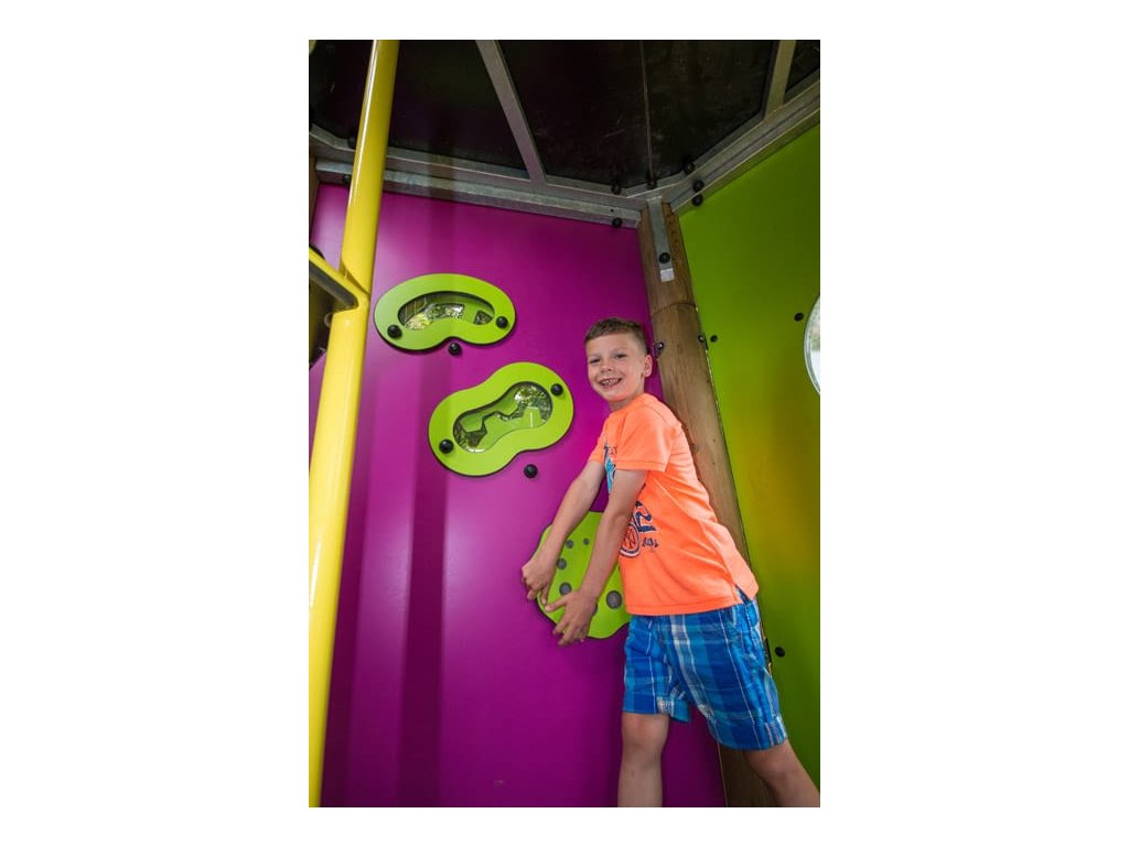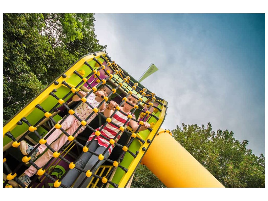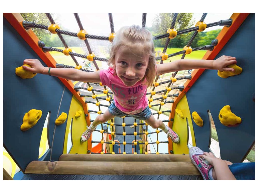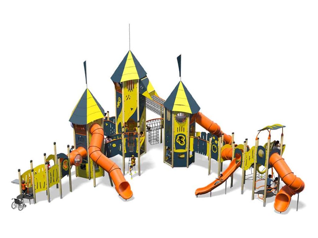 Na podestu věže se dítě dostane třeba po horolezecké cestě nebo po lezecké stěně, dolů se sklouzne v tubusové laminátové nebo ocelové skluzavce dlouhé 330 cm nebo spirálovou skuzavkou dlouhou 510 cm. Hřiště obsahuje ještě další zajímavé prvky - šikmou lanovou jámu, rozhlednu, provazník, tunel s bublinou, hrací a obloukové panely...