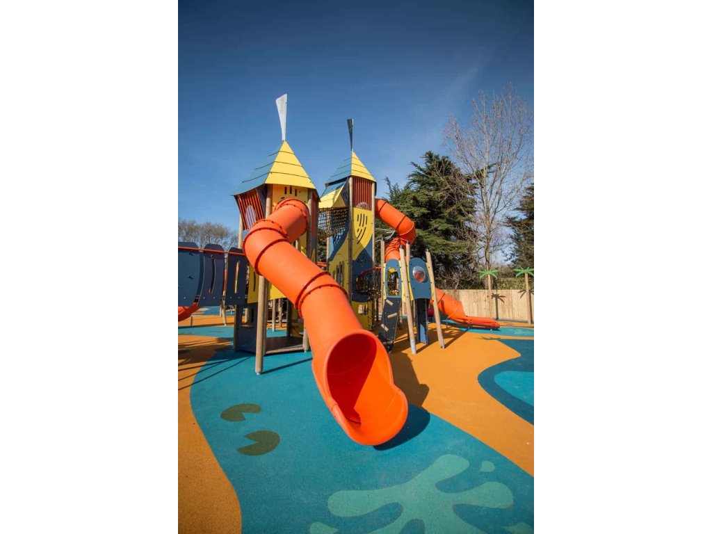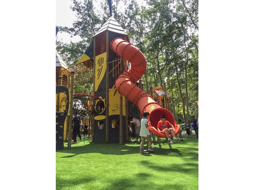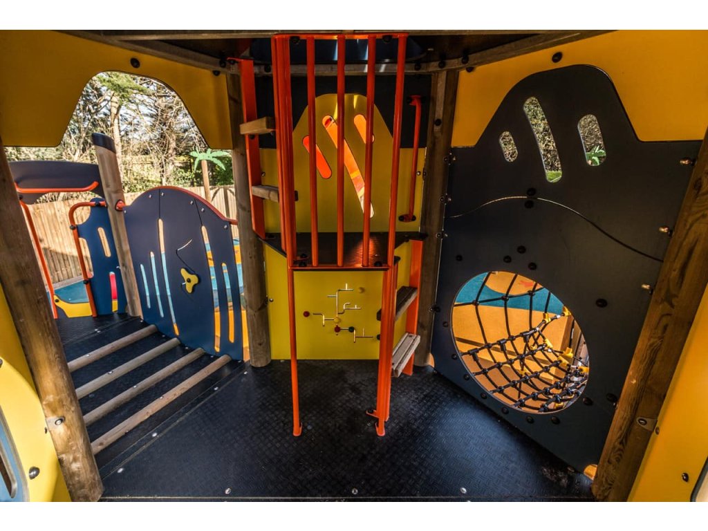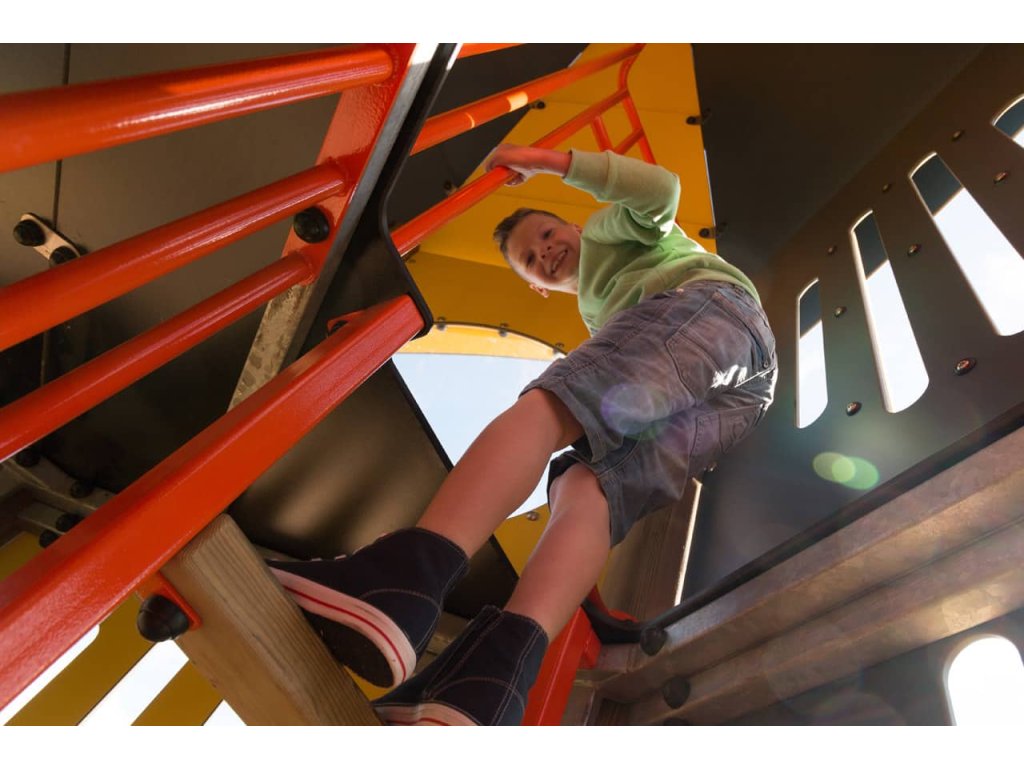 Na podestu věže se dítě dostane třeba po horolezecké cestě nebo po lezecké stěně, dolů se sklouzne v tubusové laminátové nebo ocelové skluzavce dlouhé 330 cm nebo spirálovou skuzavkou dlouhou 510 cm. Hřiště obsahuje ještě další zajímavé prvky - šikmou lanovou jámu, rozhlednu, provazník, tunel s bublinou, hrací a obloukové panely...