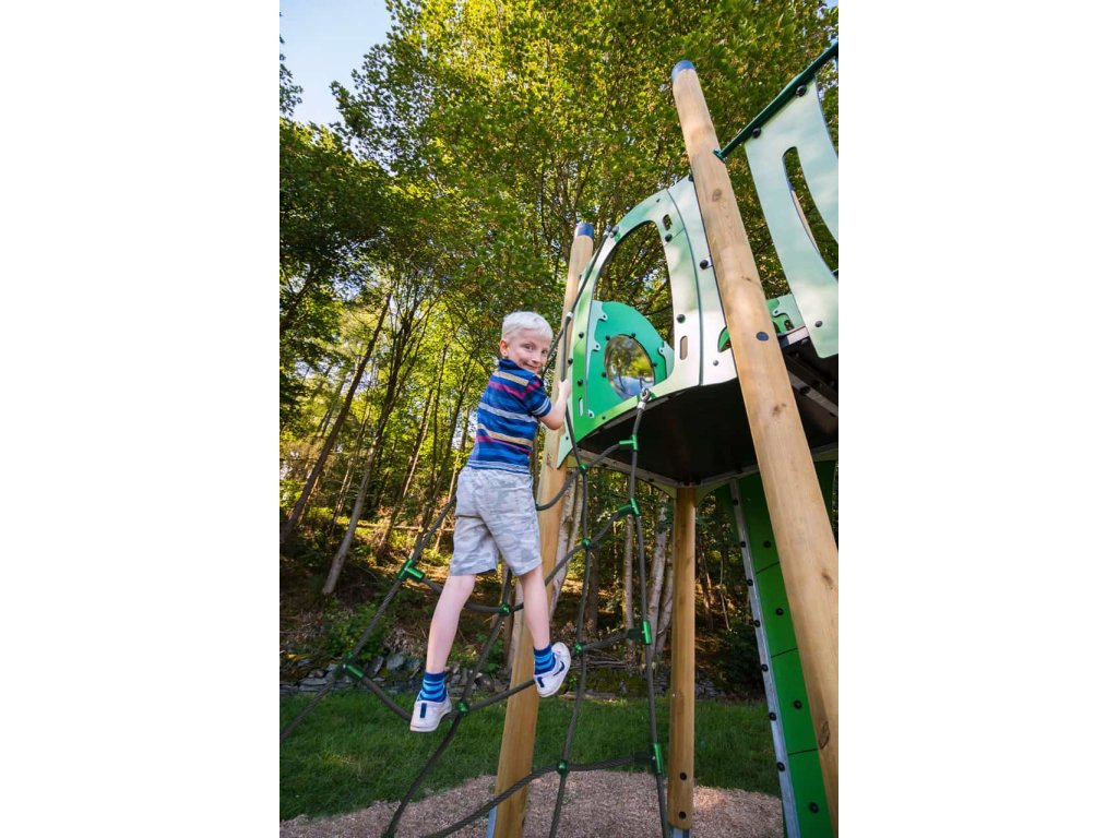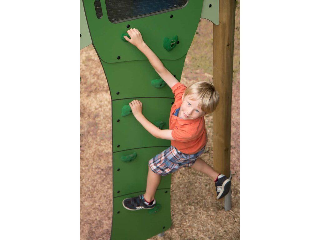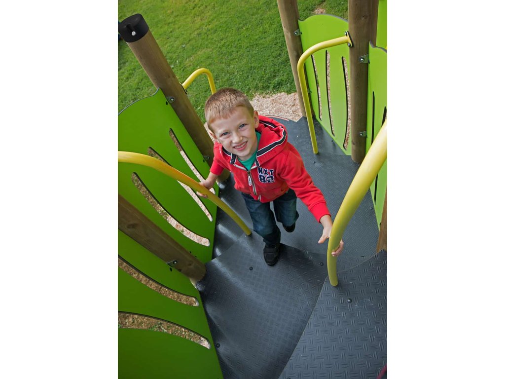 Na podestu věže 110 x 110 cm se dítě dostane po lezecké cestě nebo lanové rampě, dolů se sklouzne v tubusové laminátové nebo ocelové skluzavce dlouhé 280 cm nebo po hasičské tyči. Hřiště obsahuje ještě další zajímavé prvky - zkroucenou lanovou síť, kruhové sedadlo, lavičku, pavoučí síť, rozhlednu...