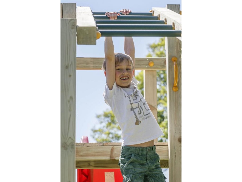 Dětské hřiště Blue Rabbit CROSSFIT je hrací věž pro udržení fyzické kondice vašich dětí. Je vyrobena z hoblovaného dřeva, ošetřeného ekologickou impregnací chránící ho před povětrnostními vlivy a prodlužující tak jeho životnost. To platí pro veškeré konstrukční hranoly ale i prkna použitá na podesty. Používáme výrobcem doporučovaný maximálně možný profil hlavních stojek 7 x 7 cm.