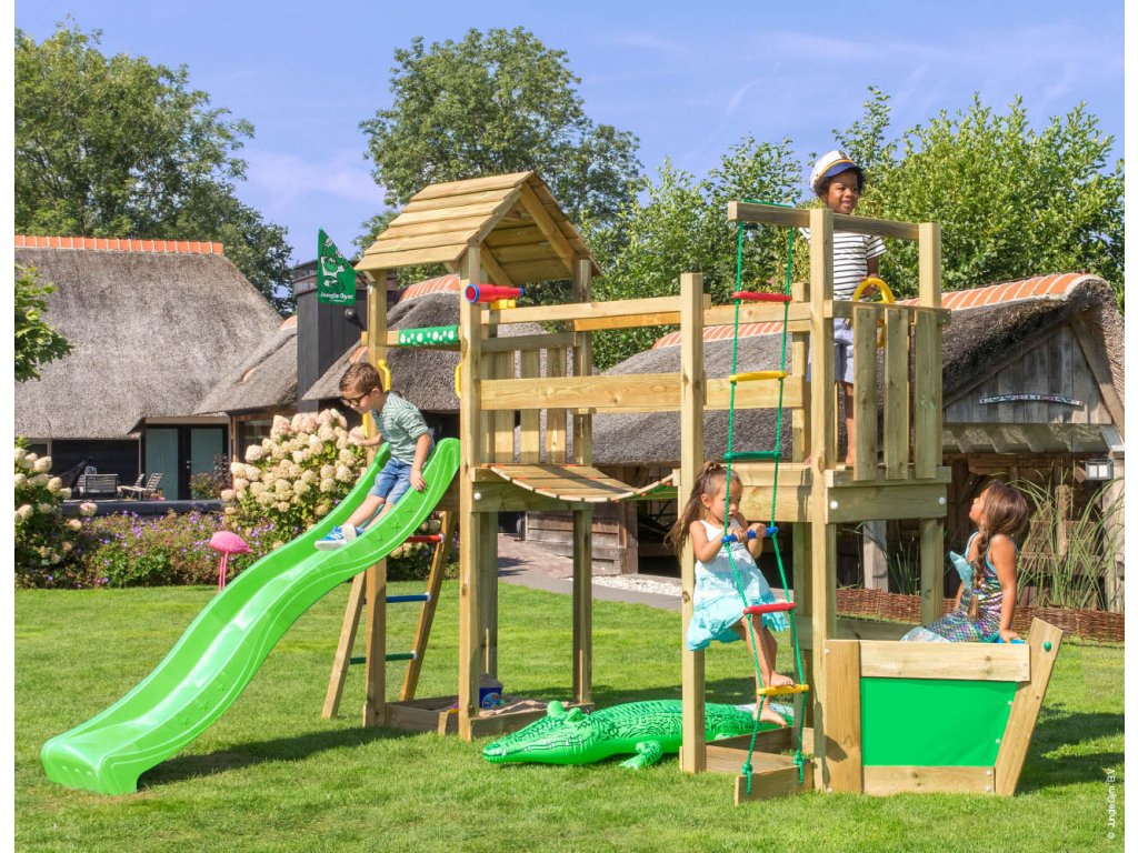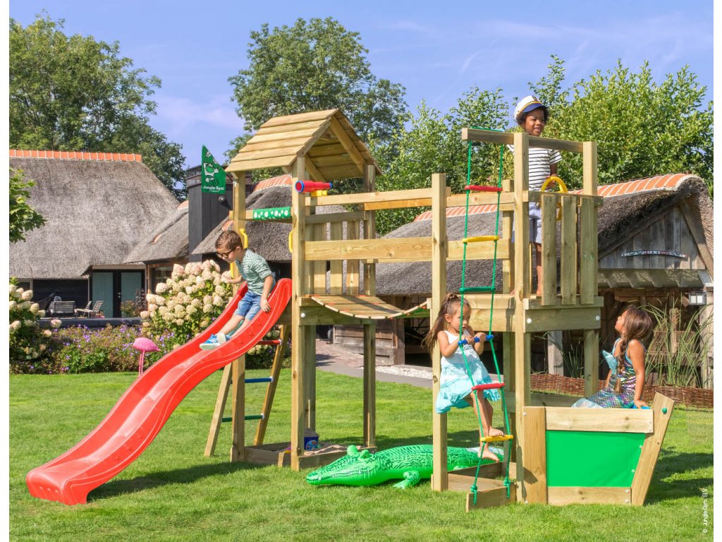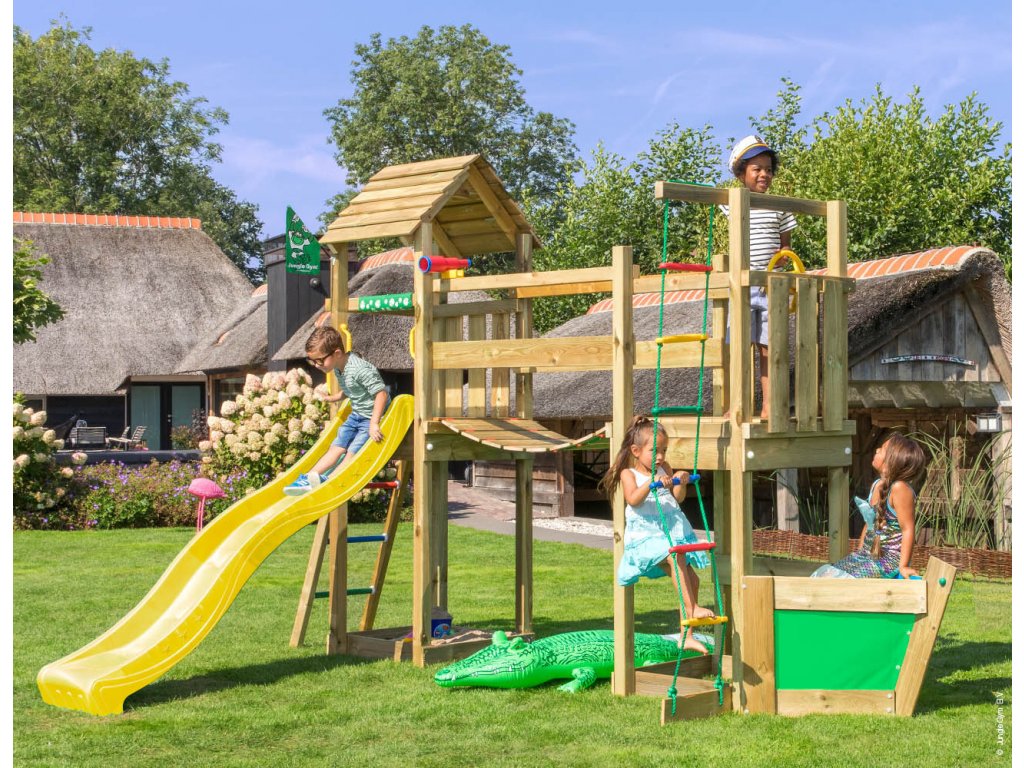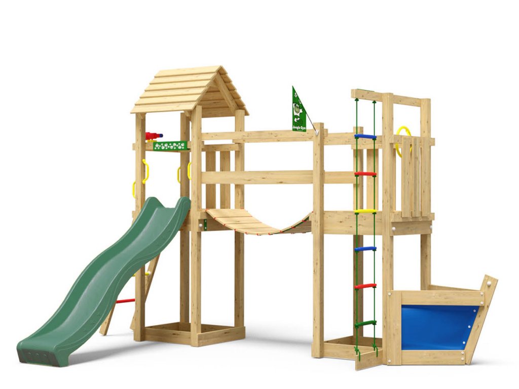 Dětské hřiště JUNGLE VOYAGER je vyrobeno z hoblovaného dřeva ošetřeného ekologickou impregnací. Chrání dřevo před povětrnostními vlivy a prodlužuje tak jeho životnost. To platí pro veškeré konstrukční hranoly i prkna terasy. Používáme výrobcem doporučovaný maximálně možný profil hlavních stojek 7x7 cm.