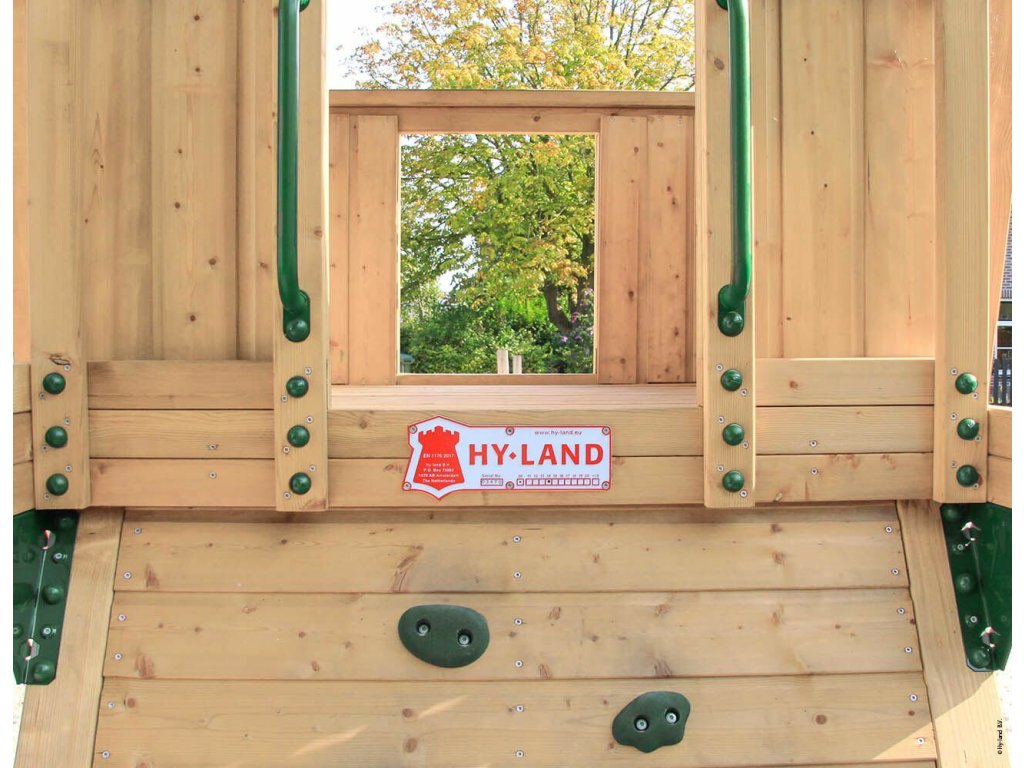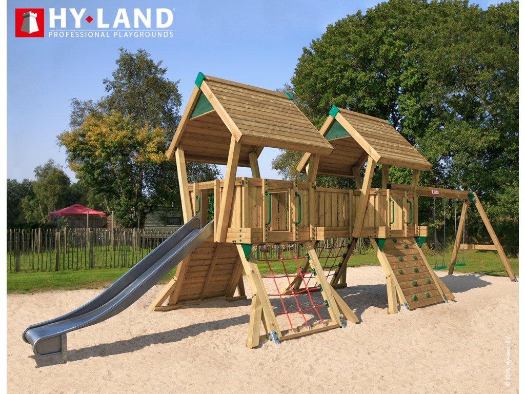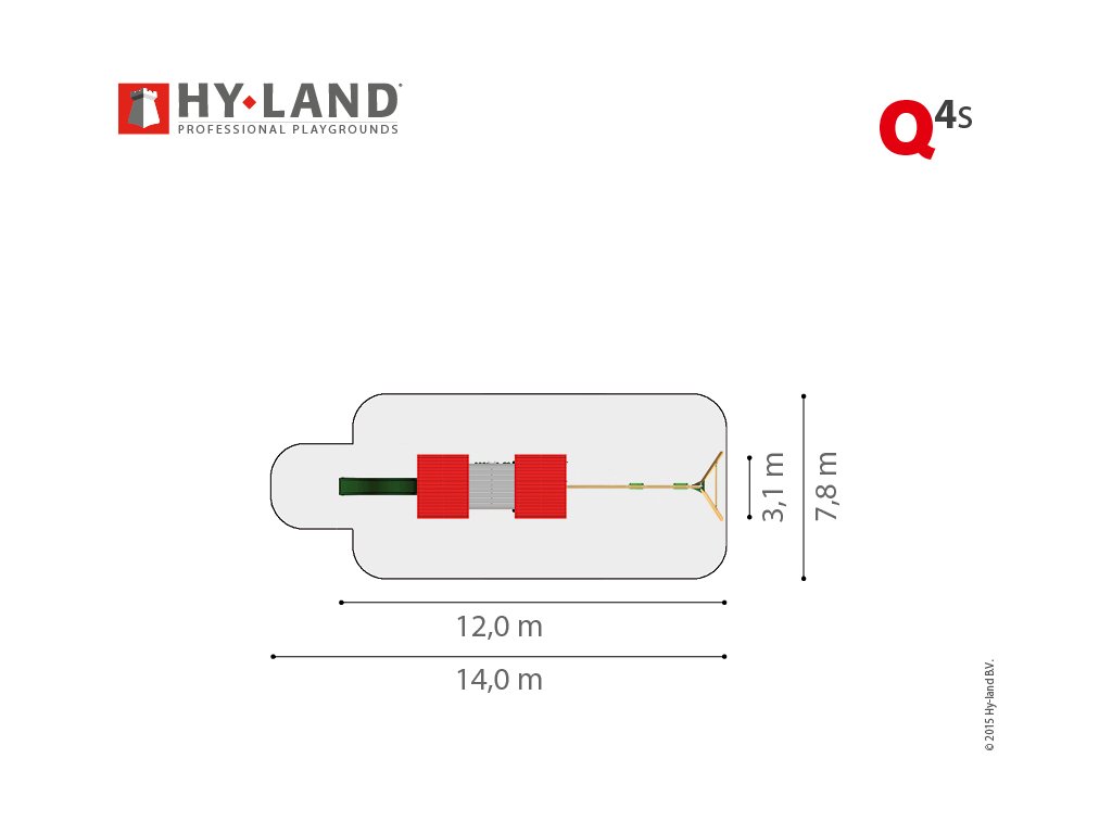 Dětské hřiště HY-LAND Q4s jsou dvě velké, zastřešené věže mezi sebou propojené podestou s dlouhou skluzavkou a houpačkový set. Dalšími prvky jsou dvě sítě a dvě lezecké stěny. Je určeno pro velkou zahradu, kemp, k restauraci, na školkové či školní hřiště nebo veřejné prostranství. Vyrobeno je z hoblovaného dřeva ošetřeného ekologickou impregnací chránící ho před povětrnostními vlivy a prodlužující tak jeho životnost. To platí pro veškeré konstrukční hranoly i prkna podesty. Používáme výrobcem doporučovaný maximálně možný profil hlavních stojek 9 x 9 cm, u houpačkového setu je profil stojek také 9 x 9 cm.
