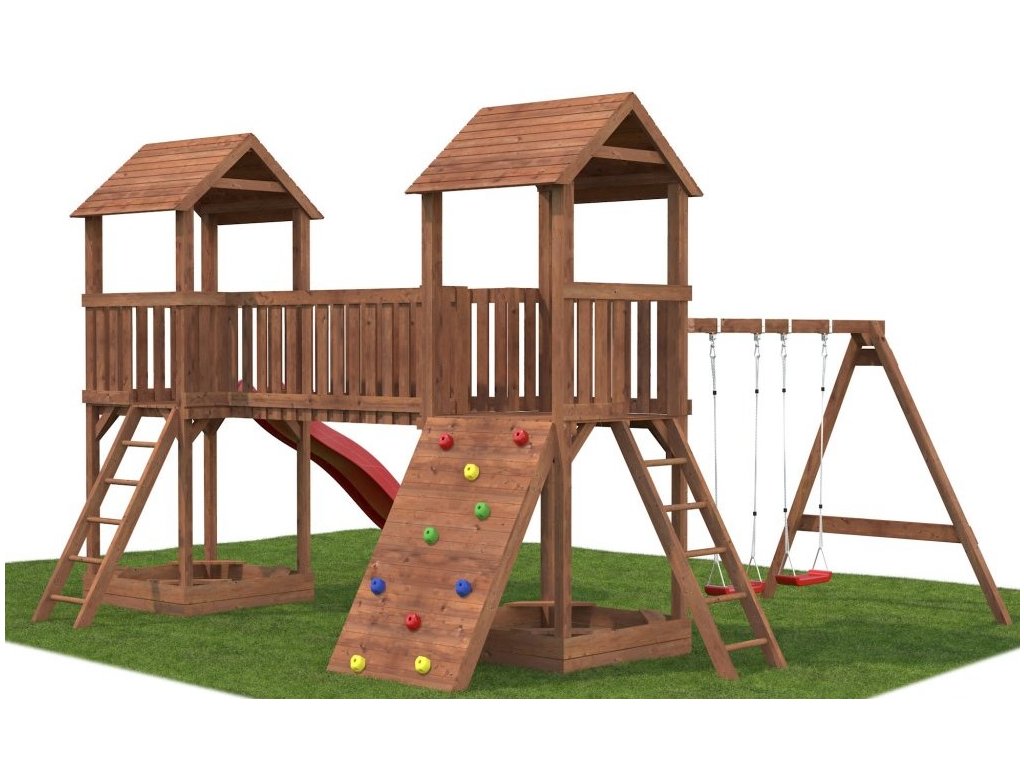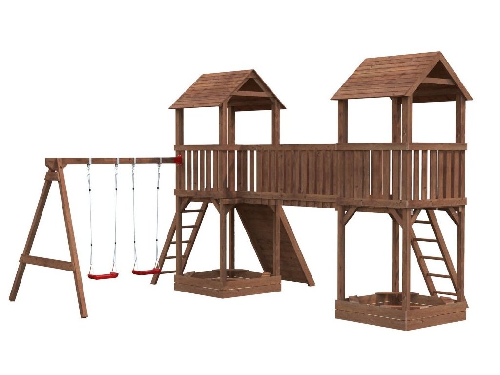 Sestava je vhodná do menší zahrady. Vyrobena je z hoblovaného dřeva ošetřeného tlakovou impregnací, chránící ho před povětrnostními vlivy, proti dřevokazným houbám, plísním, hnilobě, hmyzu a prodlužující tak jeho životnost. To platí pro veškeré konstrukční hranoly i prkna podesty a střech. Používáme výrobcem doporučovaný maximálně možný profil hlavních stojek 7 x 7 cm. U houpačkového setu je profil hlavních stojek 9 x 9 cm. Pro větší stabilitu dětského hřiště je vhodné dokoupit zemní, pozinkované, ploché kotvy, které nejsou součástí dodávky.