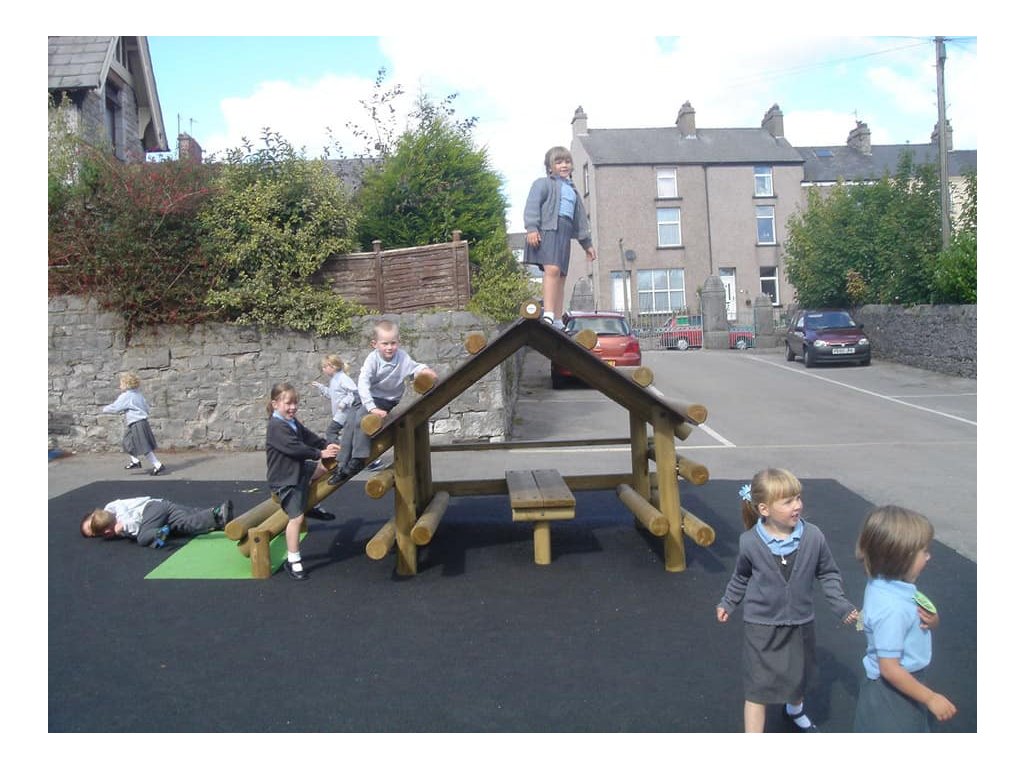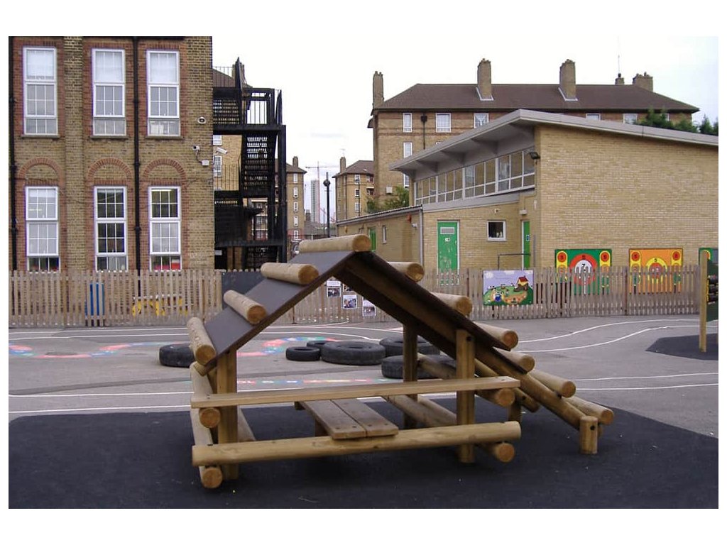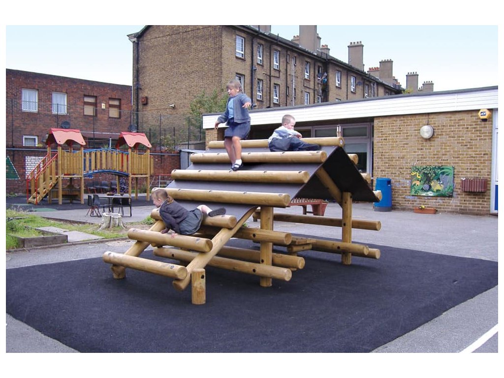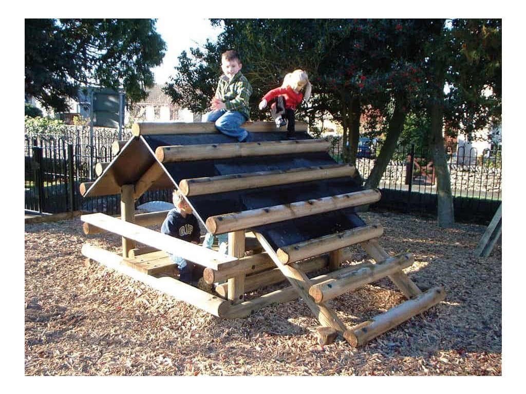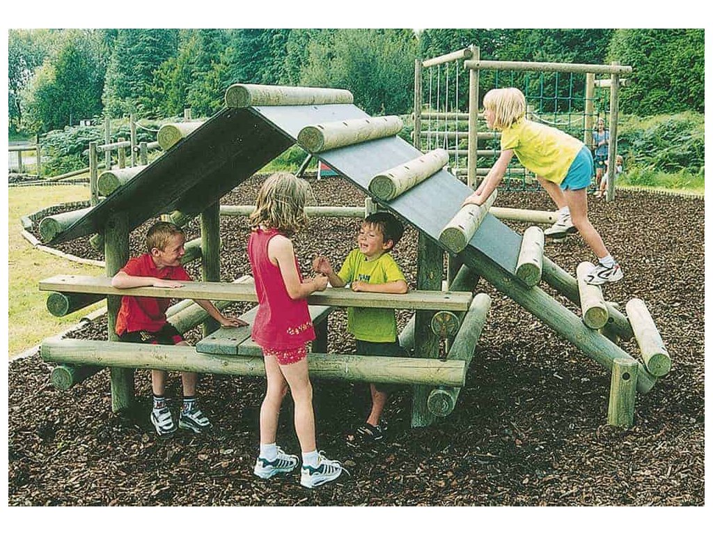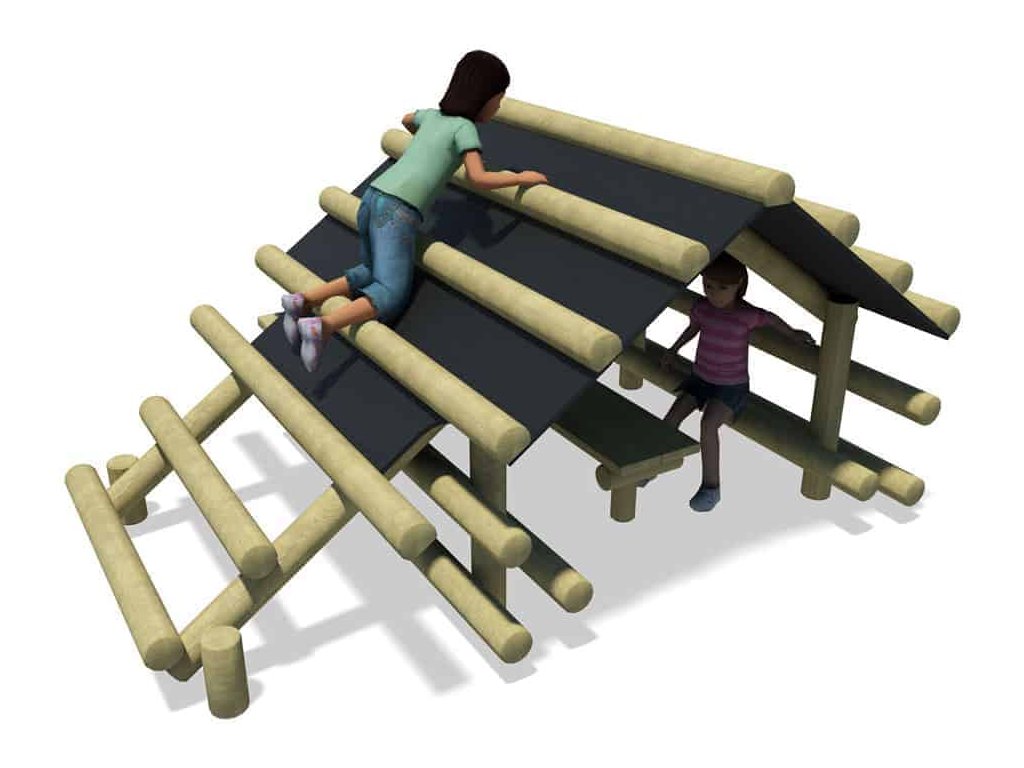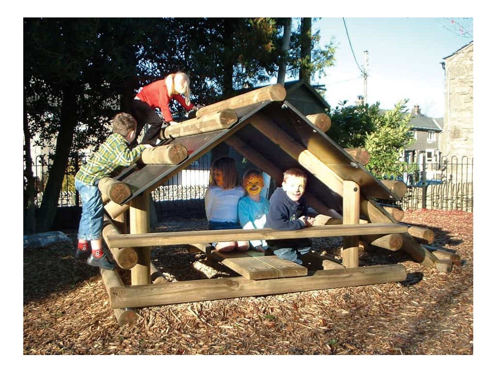 Skvělým doplněkem na školní hřiště, do parků, k restauracím, hotelům, penziónům a na různá veřejná prostranství s dostatkem místa je sestava v podobě srubu od firmy Playdale. Jejím hlavním úkolem je trénink rovnováhy a koordinace pohybu, rozvoj motorických a balančních schopností, ale také posilování při lezení po střeše. Menší děti pod dohledem a s pomocí rodičů a velké děti si sami mohou vyzkoušet svoji pohybovou šikovnost. Pod stříškou jsou dvě lavice a stůl a i v případě špatného počasí si děti mohou hrát venku.