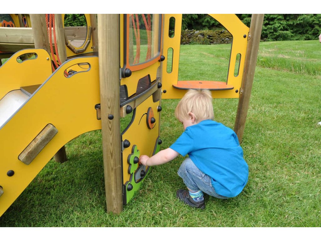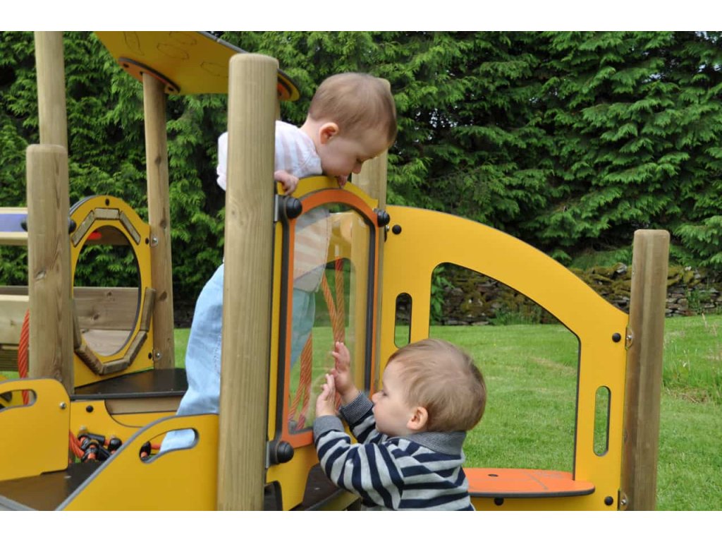 Postranní boky schůdků, skluzavky, tunelu a stříšek jsou z 12 mm silného kompaktního laminátu. Na jednu podestu lze vylést po klasickém žebříku, na druhou po točitých schůdkách, to už záleží na šikovnosti a odvaze dětí.