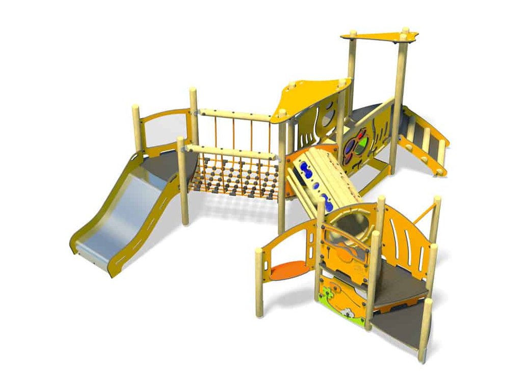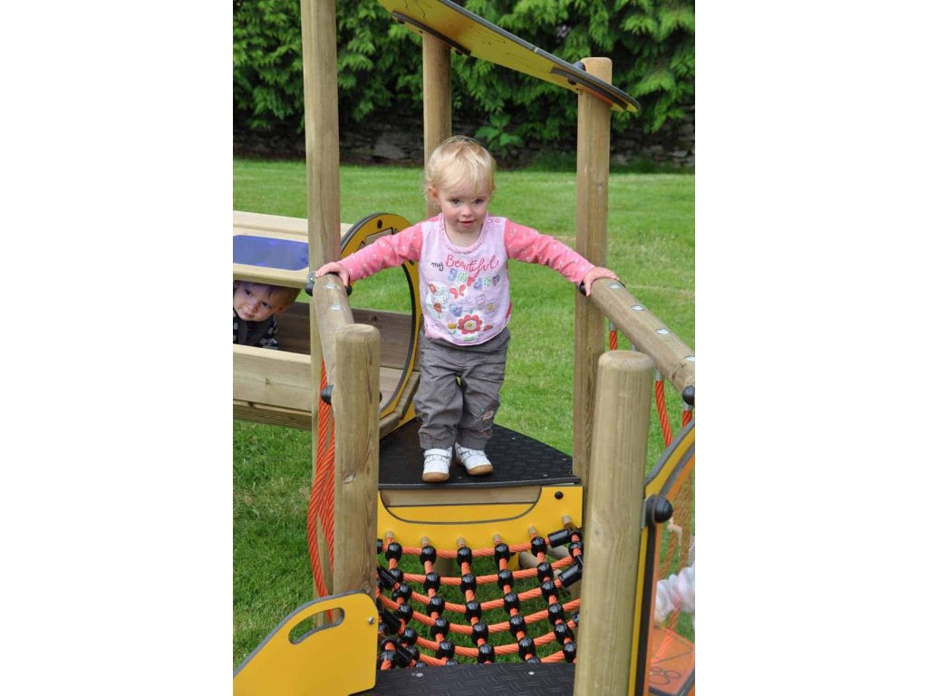 Velké dětské hřiště se dvěma stříškami, ale i s mnoha jínými prvky do každé zahrady s dostatkem místa a pro hodně dětí na hraní. Co všechno hřiště vhodné do jeslí a školek pro nejmenší děti obsahuje? Především sluzavku, kterou milují všechny děti. Dále je zde klasický a provazový žebřík, točité schodiště, prolézací tunel, můstek s postraními barevnými zábranami pro bezpečný přechod, panel s volantem, panel pro obchod, hrazda na houpání a prostor pod věží ohraničený pro případné pískoviště. Dále je zde lanový most s provazovým výpletem po stranách z bezpečnostních důvodů. Hřiště je určeno pro děti od 9 do 30 měsíců.