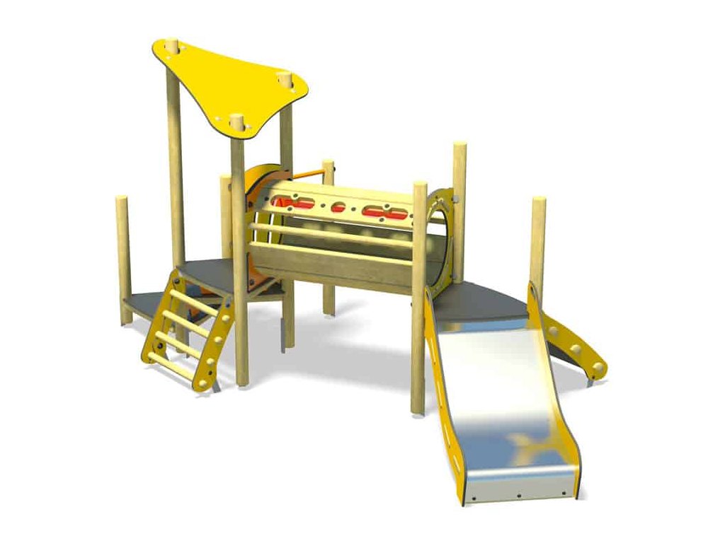 Žlutá stříška, postranní boky schůdků a skluzavky a spojovací tunel mezi dvěmi podestami jsou z 12 mm silného kompaktního laminátu. Na jednu podestu věže se děti dostanou po točitém schodišti nebo po žebříku. Prolezou tunelem a z druhé podesty vedou dvě skluzavky z nerezové oceli.