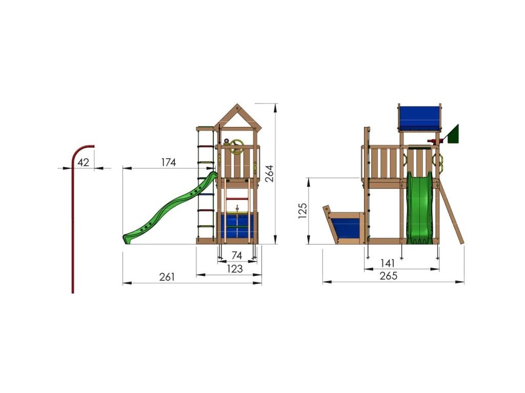 Pro lepší stabilitu se do terénu připevňuje pomocí  kovových, pozinkovaných kotev, které jsou součástí dodávky. Střecha podesty dětského hřiště je z nepromokavé látky.