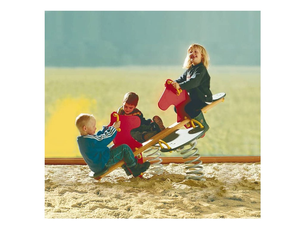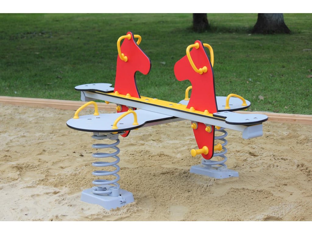 Houpadlo v podobě koníka pro čtyři děti je vyrobeno z nerezové oceli a odolného plastu. Je upevněno na dvouch silných pružinách, které jsou pomocí masivních pozinkovaných kotev zabetonovány do terénu. Maximální výška pádu je 0,85 m a proto není třeba pod houpačku speciální podklad. Postačí trávník, jemný písek nebo mulčovací kůra.