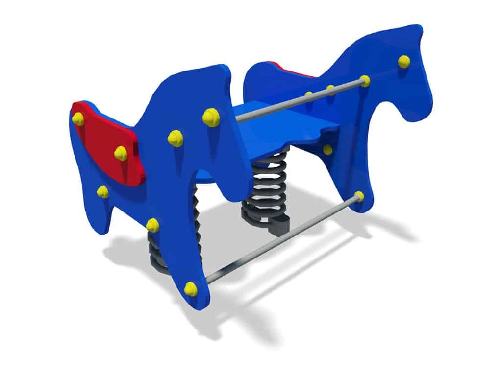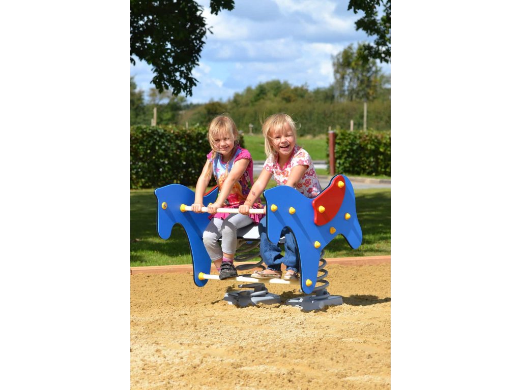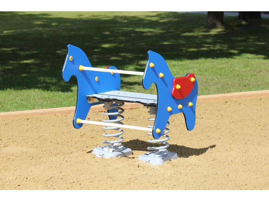 Pružinové houpadlo v podobě koníka pro dvě děti je vyrobeno z nerezové oceli a odolného plastu. Je upevněno na dvouch silných pružinách, které jsou pomocí masivních pozinkovaných kotev zabetonovány do terénu. Maximální výška pádu je 0,45 m a proto není třeba pod houpačku speciální podklad. Postačí trávník, jemný písek nebo mulčovací kůra.