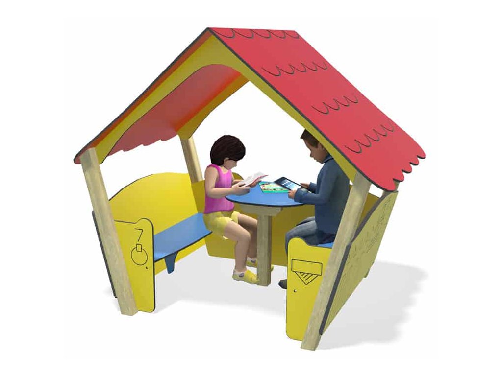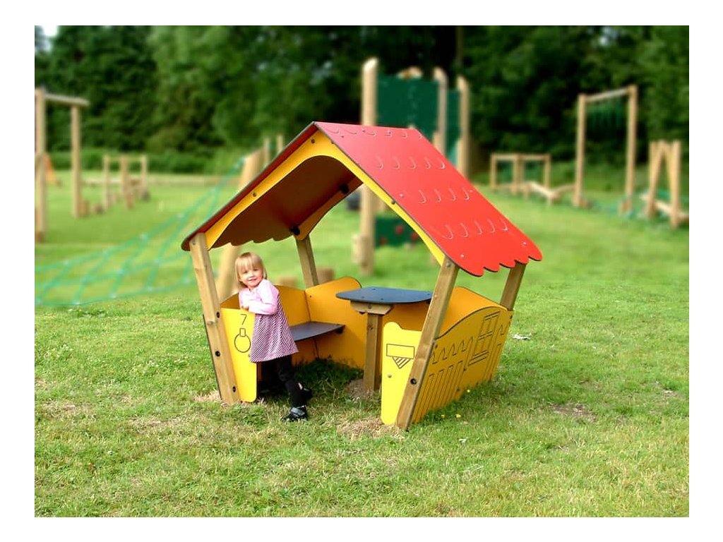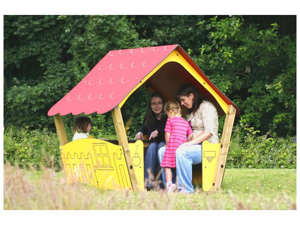 Dětský zahradní domek do jeslí a školek pro nejmenší děti je nejoblíbenější schovávačka, ale zároveň hezký barevný prvek do každé zahrady, který nezabere mnoho místa. Podpěry jsou vyrobeny z ohoblovaných dřevěných hranolů ošetřených ekologickou impregnací chránící je před povětrnostními vlivy a prodlužující tak jejich životnost. Žluté stěny, červená střecha a šedé sedačky uvnitř domečku jsou z 12 mm silného kompaktního laminátu. Hranoly je třeba k podkladu připevnit mocí pozinkovaných ocelových kotev, které jsou součástí dodávky. Postačí ho osadit do travnatého terénu. Veškeré spoje jsou chráněny plastovými krytkami. Domeček je určen pro děti od 18 měsíců do 7 let.