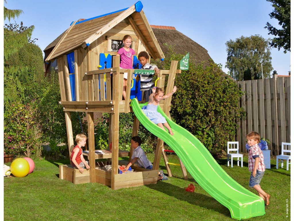 Dětský, vyvýšený, zahradní domek JUNGLE PLAYHOUSE CXL, nejoblíbenější schovávačka pro malé děti a zároveň hezký prvek do vaší zahrady, který nezabere mnoho místa. Domeček je vyroben z hoblovaného dřeva, které je ošetřené ekologickou impregnací chránící ho před povětrnostními vlivy a prodlužující tak jeho životnost. To platí pro veškeré konstrukční hranoly i prkna stěn a střechy. Používáme výrobcem doporučený maximálně možný profil hlavních stojek 9x9cm.