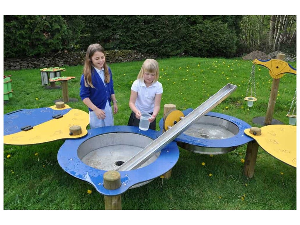 Ideální zábava pro malé děti, které si rády hrají s vodou. Dvě spojené nádrže na vodu nebo písek s výpustí, posuvným víkem a ocelovým žlábkem je krásným doplňkem na dětská hřiště mateřských škol, ale i k restauracím nebo penzionům. Dřevěné sloupky jsou vyrobeny z hoblovaného, na míru nakráceného dřeva ošetřeného ekologickou impregnací. Na sloupcích jsou připevněny nerezové nádrže na vodu nebo písek a doplněny vahadlovým žlábkem.