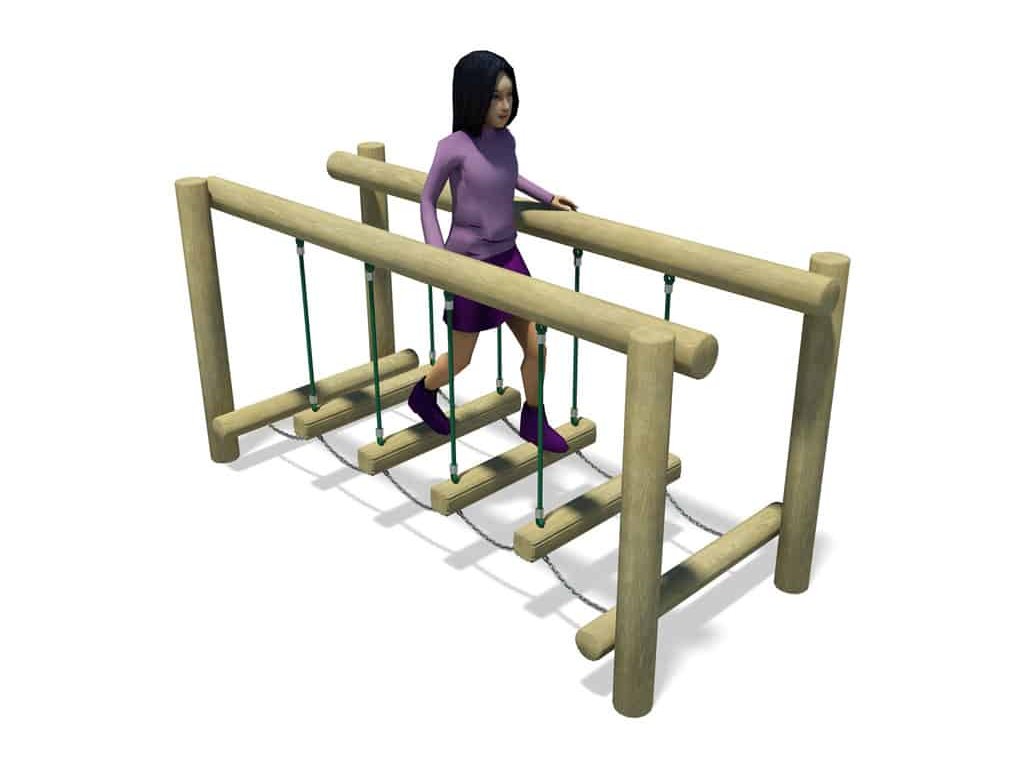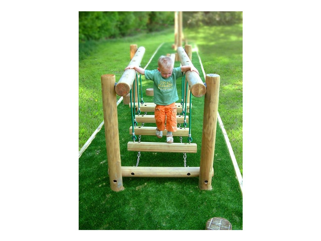 Jak trénovat rovnováhu a koordinaci pohybu? Skvělým doplňkem dětských hřišť do parků, k restauracím, hotelům a na různá veřejná prostranství je kývající se most od firmy Playdale. Nosná konstrukce houpací lávky je vyrobena ze smrkové středové kulatiny a samotná lávka je vyrobena z opracované kulatiny, která je zavěšena na žárově zinkovaných řetězech a velmi dobře odolává případným vandalům. Všechny kovové díly jsou ošetřeny zinkem proti korozi. Z důvodu prodloužení trvanlivosti je dřevo impregnováno. Sestavu lze k podkladu připevnit několika způsoby - zapustit do půdy nebo připevnit pomocí pozinkovaných ocelových kotev, které jsou součástí dodávky.