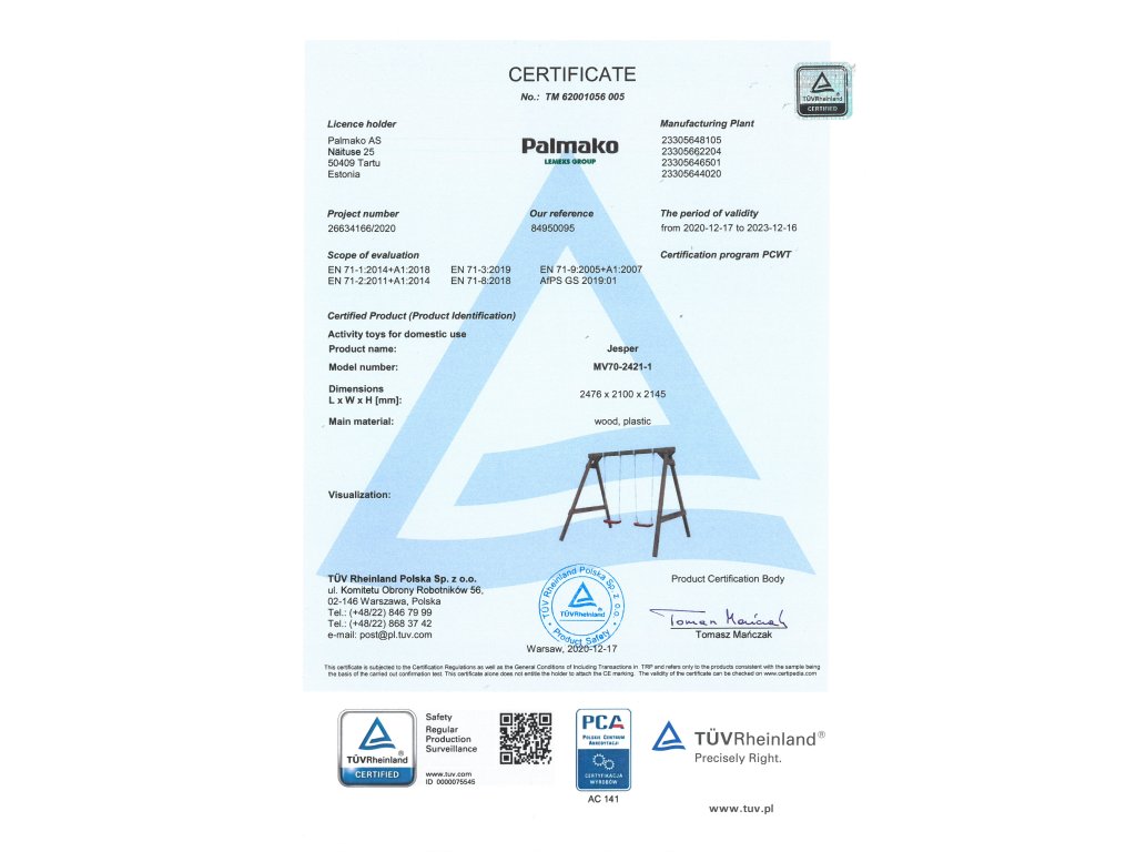 Kids Jesper je houpačka pro dvě děti vhodná do menší zahrady. Vyrobena je z hoblovaného dřeva ošetřeného tlakovou impregnací chránící ho před povětrnostními vlivy a proti dřevokazným houbám, plísním, hnilobě a hmyzu a prodlužující tak jeho životnost. To platí pro veškeré konstrukční hranoly. Používáme výrobcem doporučovaný maximálně možný profil hlavních stojek 9 x 9cm.