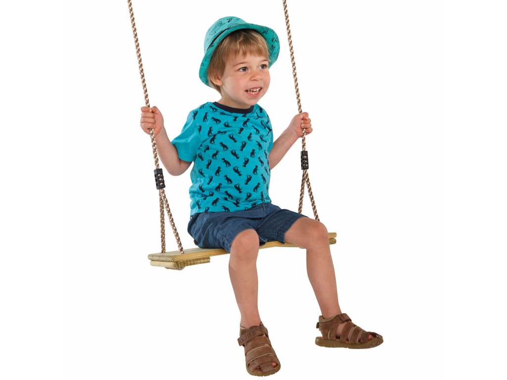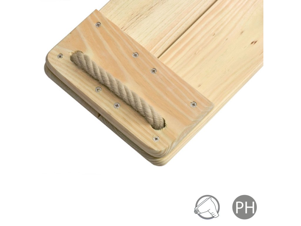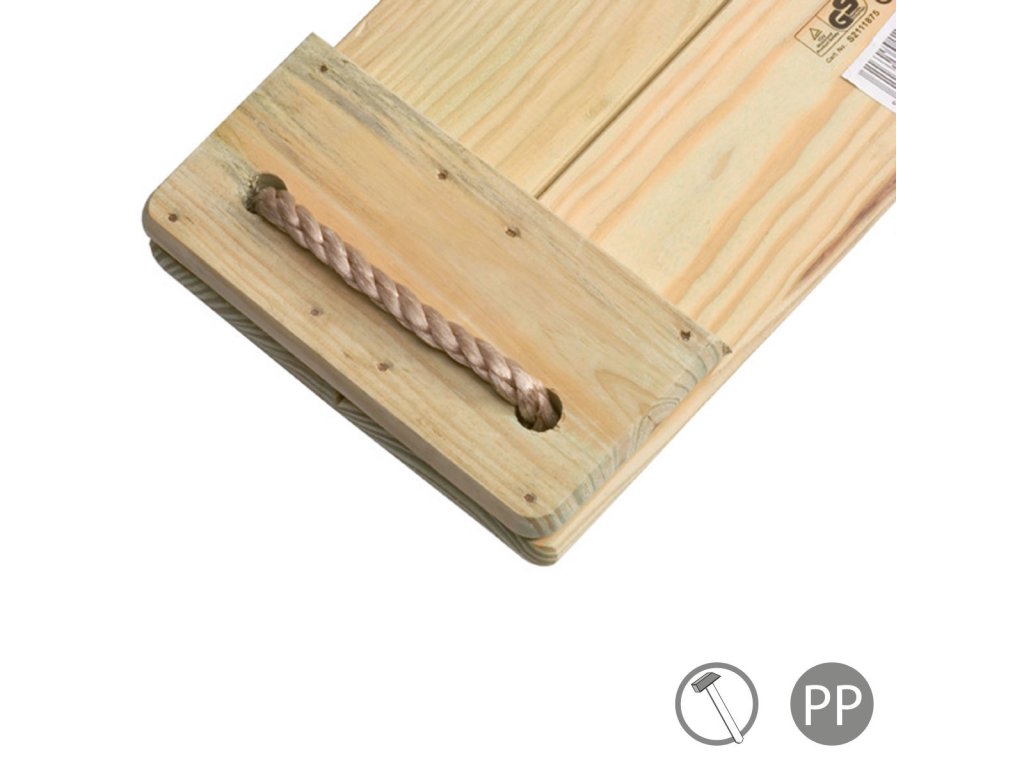 Houpačka vyrobená z borovicového dřeva s velkou sedací plochou se dodává ve dvou verzích. Sedadla s lany o průměru PH 12 mm jsou přišroubována šrouby z nerezové oceli, zatímco u lan s PP o průměru 10 mm jsou připevněny hřebíky. Kroužky a osmičky jsou vyrobeny z pozinkované oceli. Sváry na lanech jsou vyrobeny z černého PP. Z důvodu větší odolnosti proti povětrnostním podmínkám je dřevo naimpregnováno. Výška pro zavěšení houpačky je 185 cm až 240 cm.
