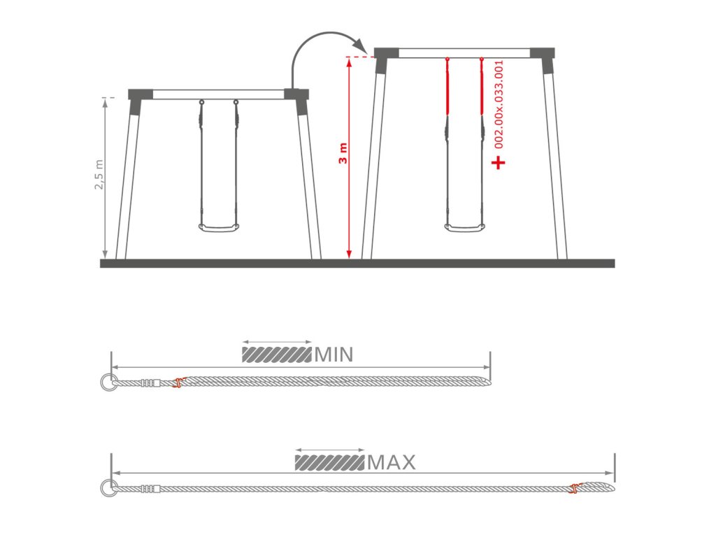 Nastavovací lana KBT prodlužují délku lana stávajícího houpacího příslušenství v situacích, kdy houpací příslušenství nedostačuje výšce houpací konstrukce. Jsou k dispozici v různých délkách.