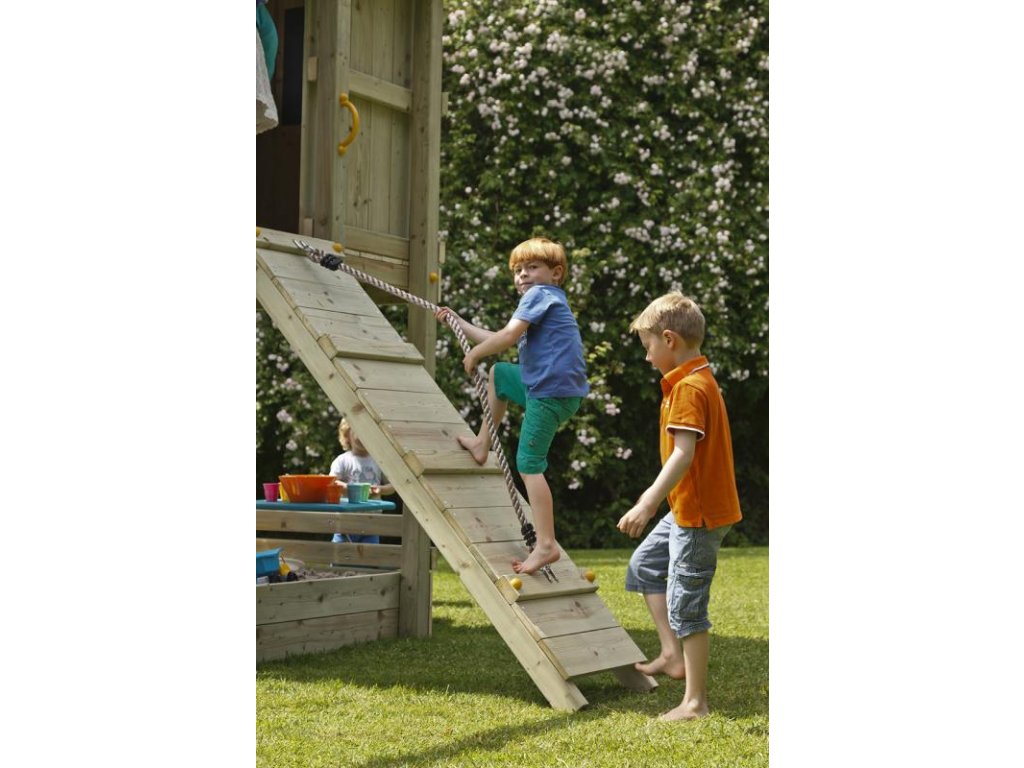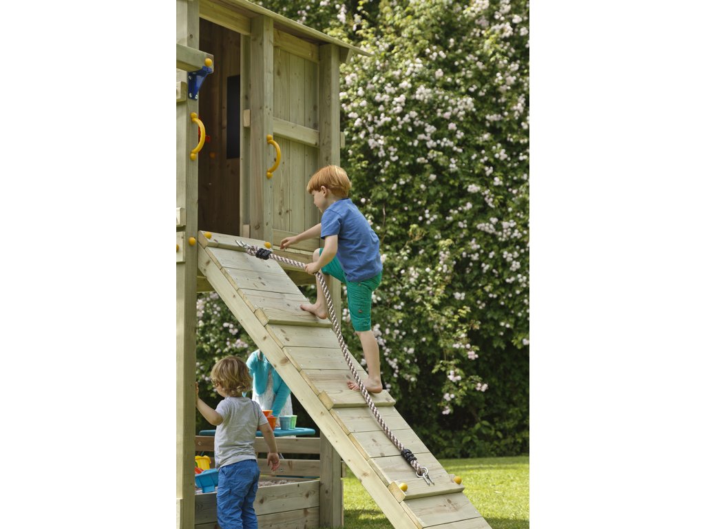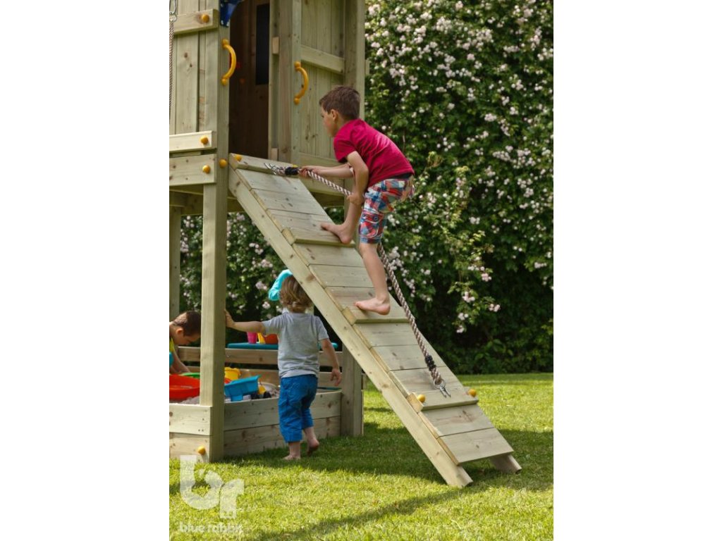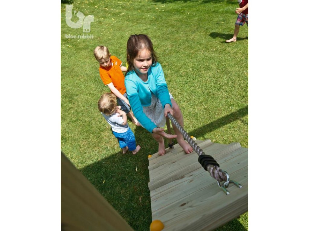 Ke každé herní věži Blue Rabbit 2.0 můžete přidat modul @ramp a vytvořit tak alternativní a náročný vstup. Tlusté lano poskytuje vynikající úchop pro ruce malých dětí. Speciální stupačky na dřevěné rampě usnadňují lezení.