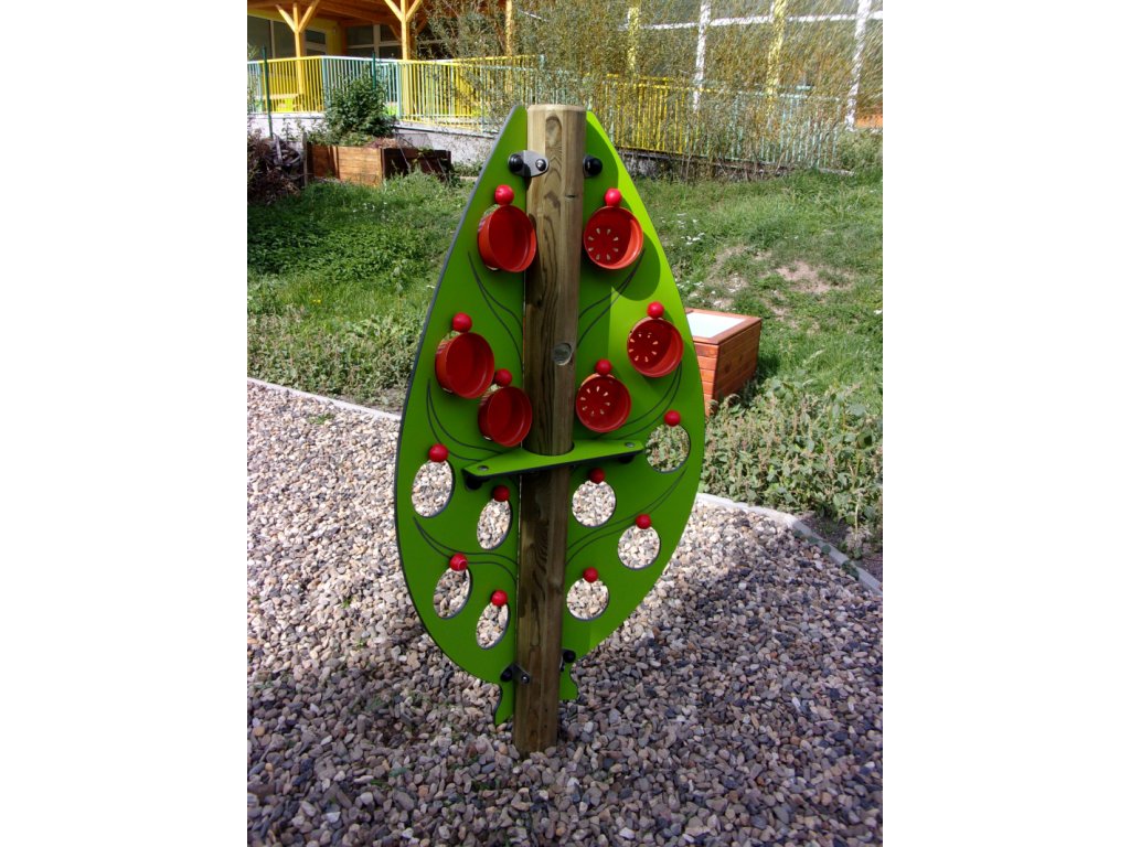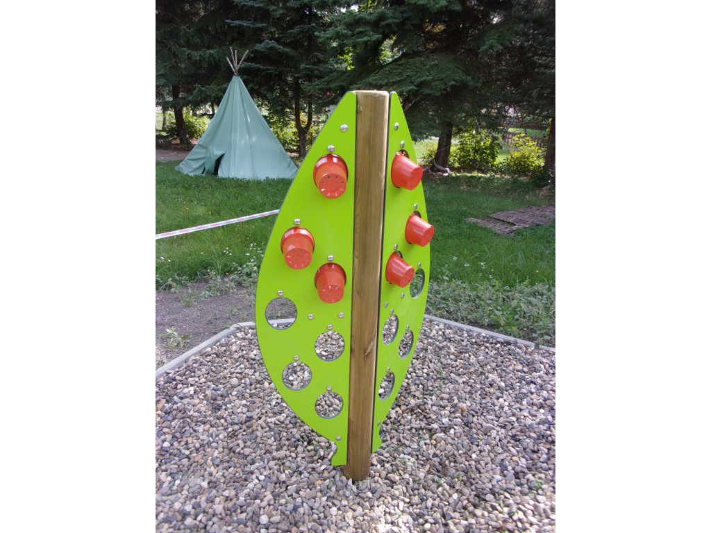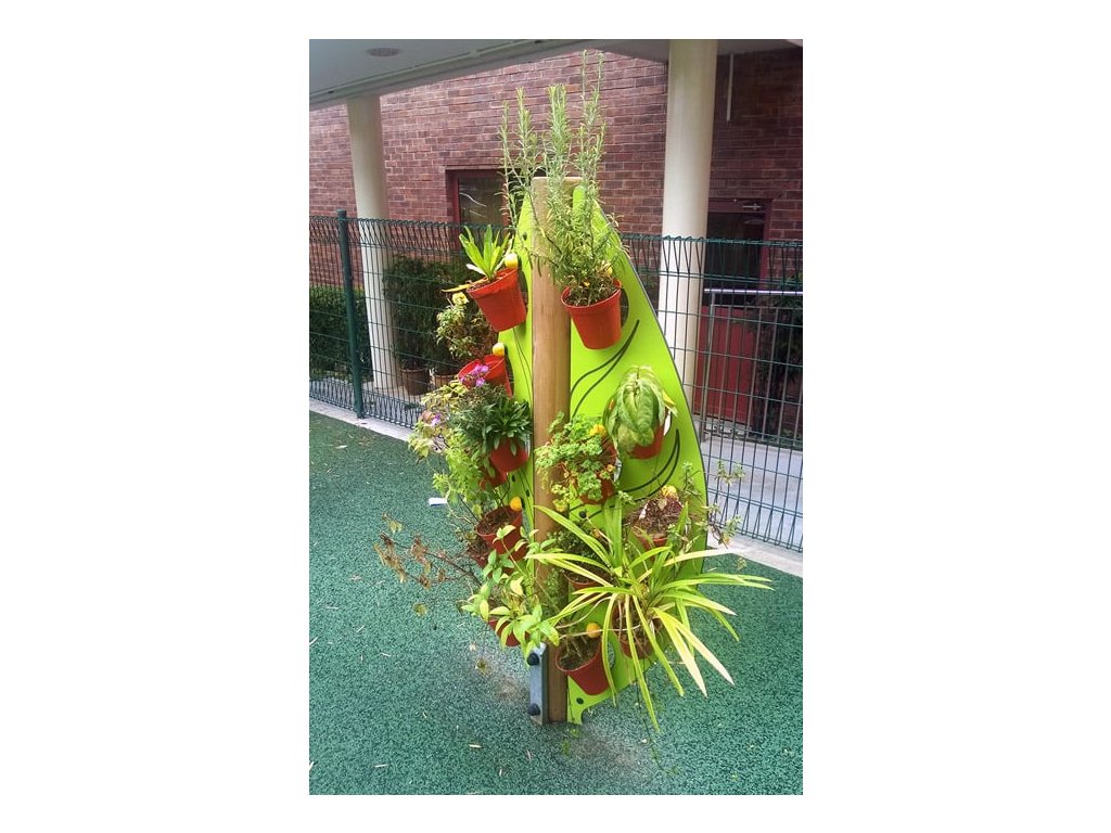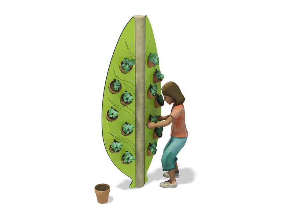 Pro děti které rády pěstují pnoucí rostliny je připraven stojan ve tvaru velikého listu se 14 závěsnými květníky od firmy Playdale. Střed listu je z opracované středové kulatiny ke které je ze dvou stran připevněn kompaktní laminát v barvě a tvaru listu s výřezy pro květníky.