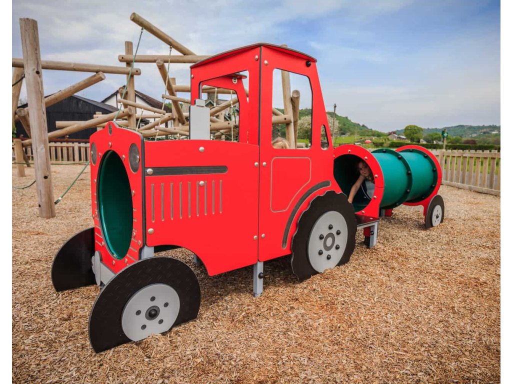 Celý herní prvek je vyrobený z 12 mm silného kompaktního laminátu. Traktor má vpředu tunel, kterým se mohou děti proplazit až do kabiny. Zde mohou stát na plošině řidiče a rozjet se po farmě. Vlek ve tvaru cisterny mohou děti využívat stejně.