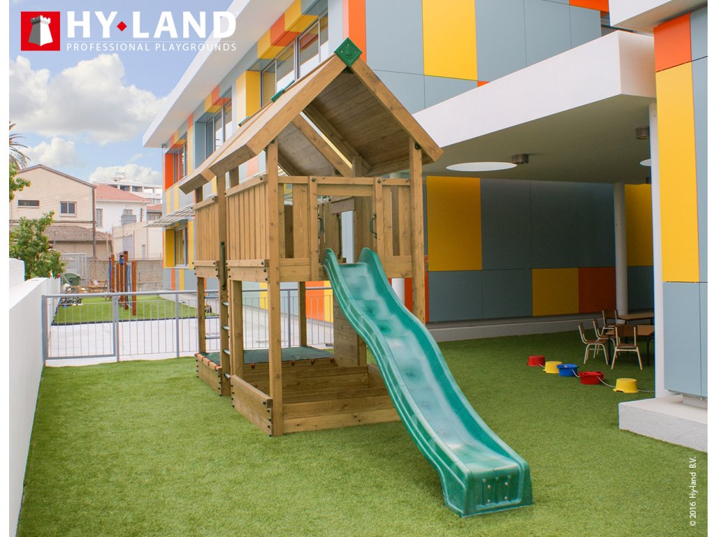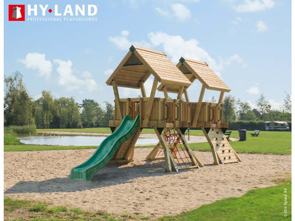 Dětské hřiště HY-LAND P4 jsou dvě propojené, ale i zastřešené věže s dlouhou skluzavkou. Je určeno pro větší zahradu, kemp, k restauraci, na školkové či školní hřiště nebo veřejné prostranství. Hřiště je vyrobeno z hoblovaného dřeva ošetřeného ekologickou impregnací chránící ho před povětrnostními vlivy a prodlužující tak jeho životnost. To platí pro veškeré konstrukční hranoly i prkna podesty a střech. Používáme výrobcem doporučovaný maximálně možný profil hlavních stojek 9 x 9 cm.
