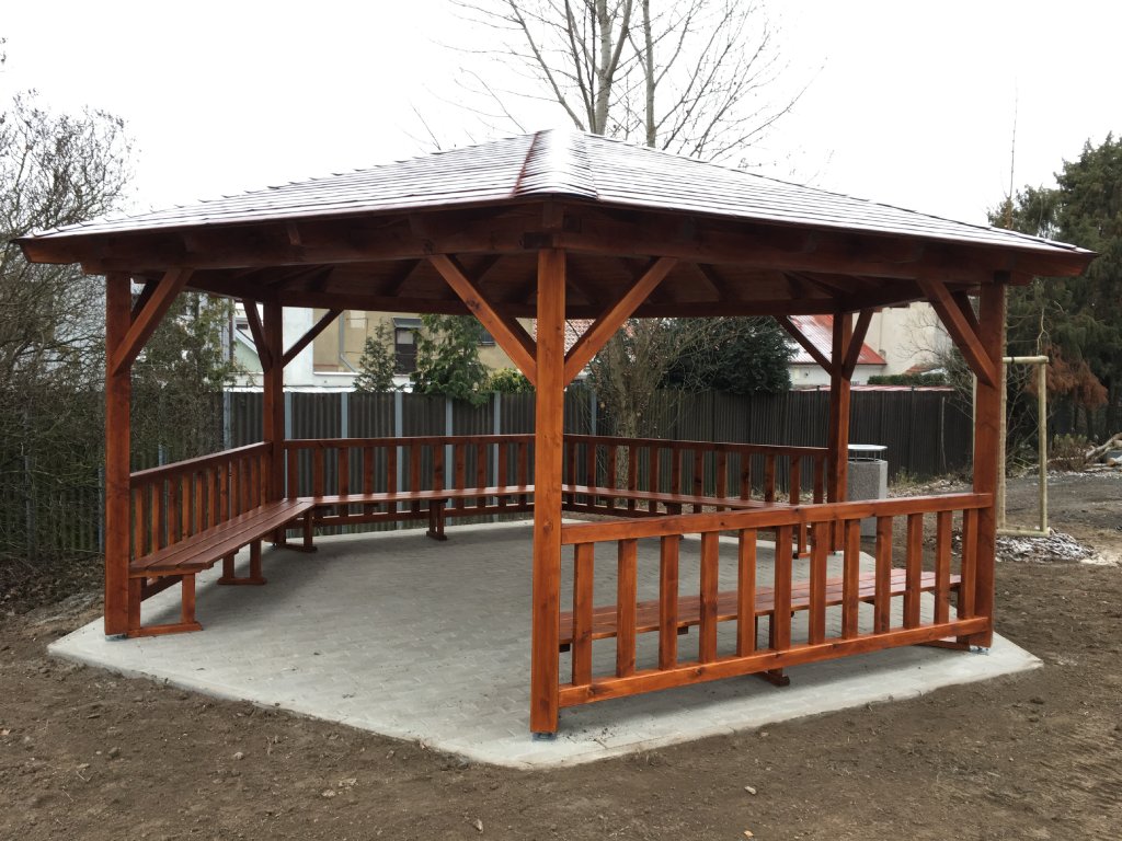 - Vybavena zábradlím a na pevno přidělanými čtyřmi lavicemi