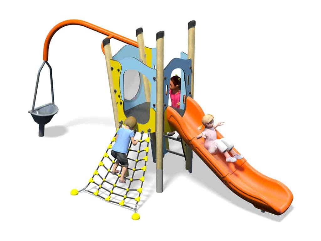 Na podestu věže 55x55 cm se dítě dostane po provazovém žebříčku nebo po žebříku klasickém. Dolů se sklouzne po laminátové nebo ocelové skluzavce dlouhé 90 cm. Věž má navíc ještě po straně otočný trychtýř.