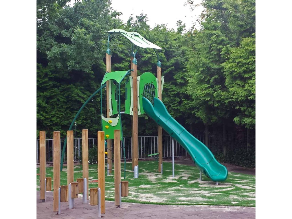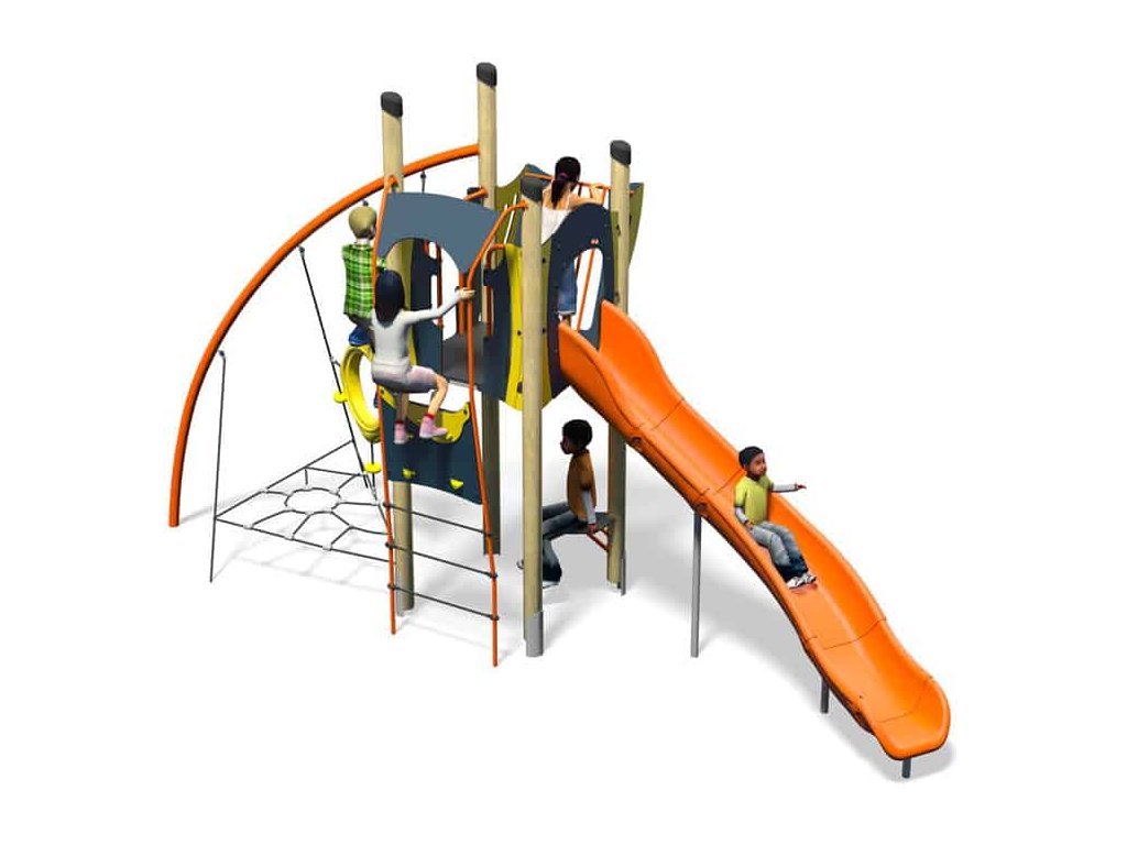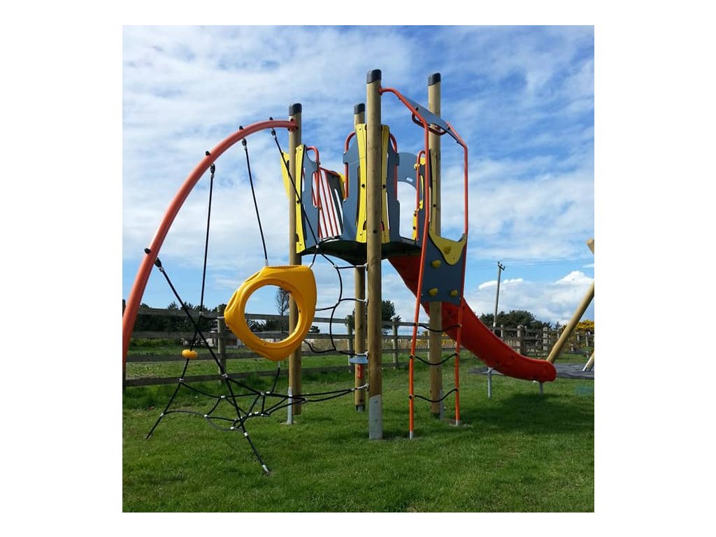 Na podestu věže 110 x 110 cm se dítě dostane několika cestami - po horolezecké cestě nebo po provazníku. Dolů se sklouzne po otevřené nebo uzavřené, laminátové nebo ocelové skluzavce dlouhé 190 cm.