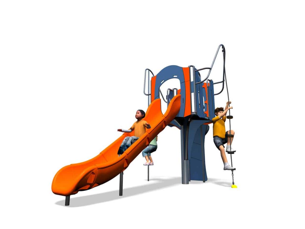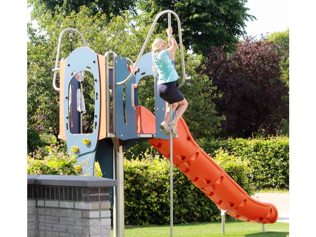Na podestu věže 110 x 110 cm se dítě dostane několika cestami - po hasičské tyči, lezecké stěně nebo šplhem na laně. Dolů se sklouzne po otevřené laminátové nebo ocelové skluzavce dlouhé 150 cm.