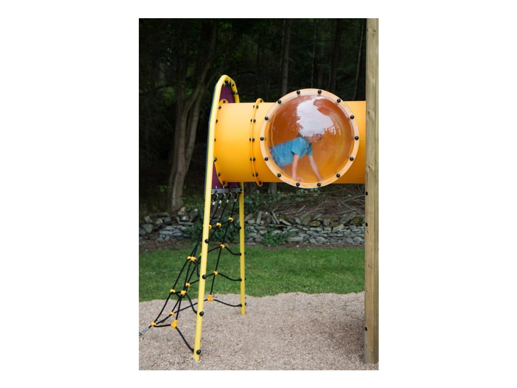 Na podestu věže 110 x 110 cm se dítě dostane několika cestami - po lezecké stěně, šplhem po laně nebo po síti a tunelem s bublinou. Dolů se sklouzne po otevřené nebo uzavřené, laminátové nebo ocelové skluzavce dlouhé 150 cm.