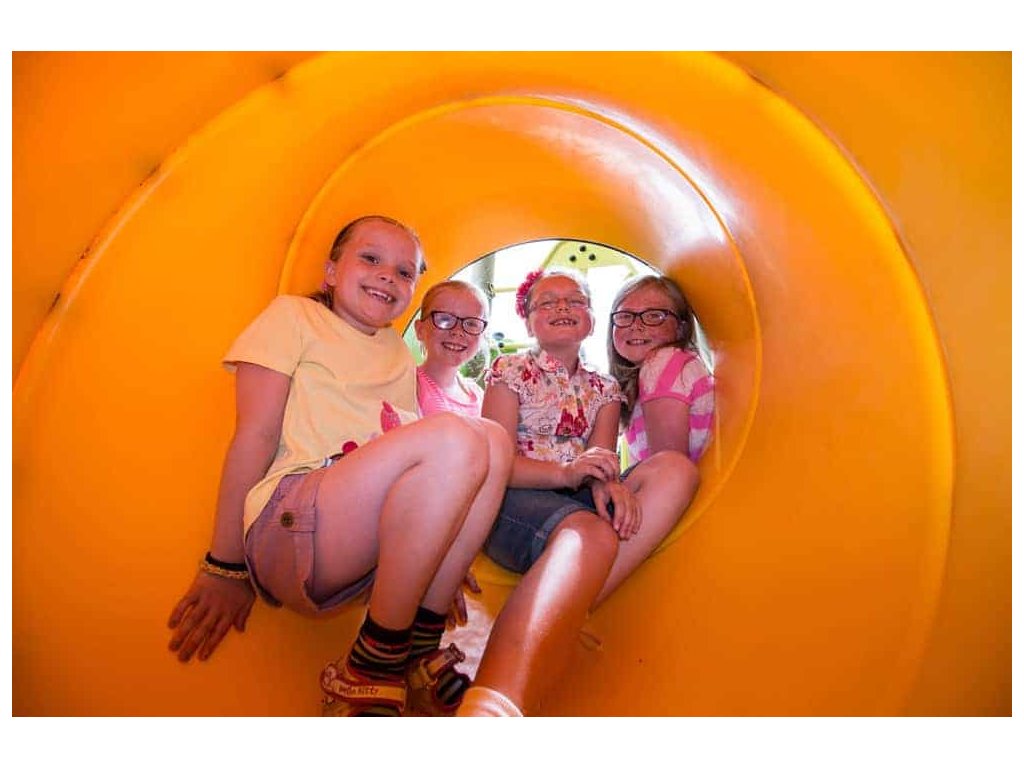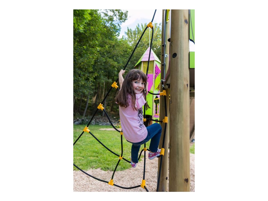 Na podestu věže 110 x 110 cm se dítě dostane několika cestami - po lezecké stěně nebo provazníku. Dolů se sklouzne po uzavřené (tubusové) laminátové nebo ocelové skluzavce dlouhé 150 cm.